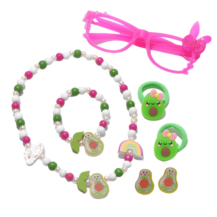 Набор детский "Выбражулька" состоящий из двух заколок, пары клипс, игрушечных очков, бус и браслета на большой красочной подложке в форме авокадо. Украшения можно одевать как все сразу, так и использовать по одному, примеряя к разными нарядам маленьких модниц. Авокадо может послужить для хранения набора, быть использован в качестве трафарета и применён в различных детских играх. Многофункциональный набор - отличный подарок для девочек.