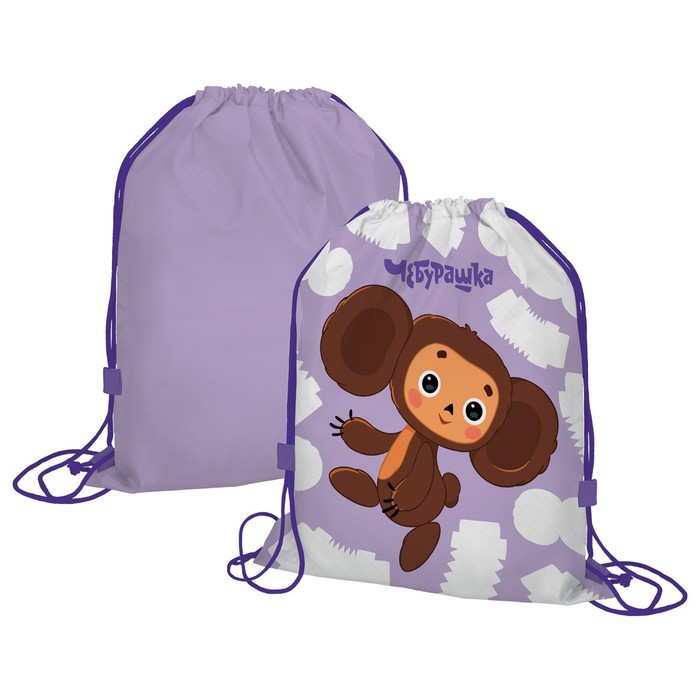 Мешок для обуви малый с изображением Чебурашки. Его удобно использовать для хранения и переноски сменной обуви, а также для различных мелочей, которые могут понадобится ребенку в дороге или на занятиях. Мешок выполнен из плотного водостойкого материала. Он затягивается сверху при помощи текстильных шнурков, которые фиксируются в нижней части, благодаря чему его можно носить за спиной, как рюкзак. Размер 27 x 32 x 1 см.