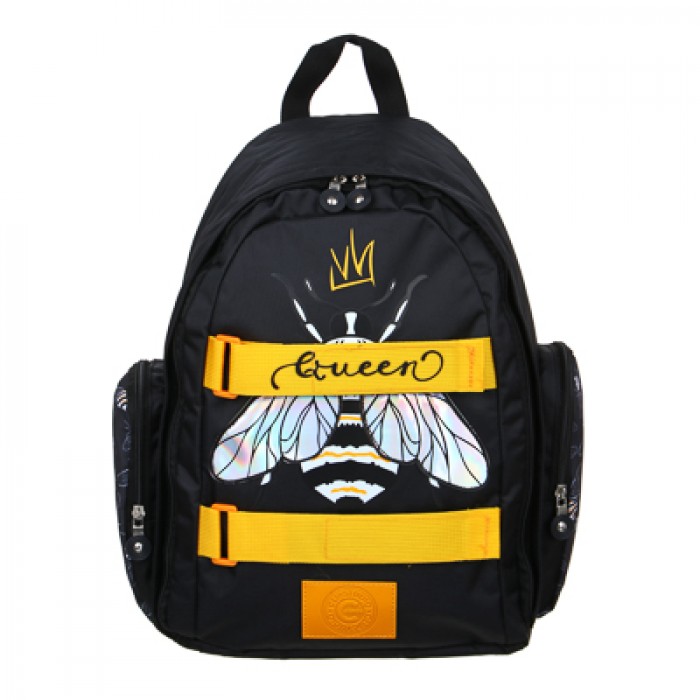 Подростковый рюкзак "Королевская пчелка", 42х29х14 см подходит как для школы, так и для повседневного использования в городе. Стильный дизайн в черном цвете с декором «крылья» дополнит образ и сделает его уникальным! Имеет одно вместительное отделения на молнии и 2 боковых кармана. Обладает легким весом, при этом выдерживает высокие нагрузки, не растягивается и не рвется. Широкие лямки с регулировкой не натирают и не нагружают плечи, равномерно распределяя нагрузку по спине. Сверху расположена петля из текстиля для того, чтобы вешать рюкзак на крючок школьной парты.1 отд., 2 карм.,2 липучки, декор "крылья",