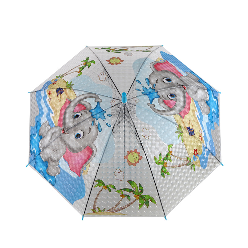 Прозрачный полуавтоматический зонт-трость для детей от Джамбо Тойз подарит ребенку радость и веселье от прогулки даже в дождливую погоду. Украшен трехмерным принтом - забавный слоненок уютно расположился на куполе зонта. Сам купол диаметром 84 см надежно укроет ребенка от непогоды. Гулять с таким зонтиком будет интересно и увлекательно! Цветная изогнутая ручка зонтика-трости удобна для детской руки. Спицы зонтика снабжены безопасными пластиковыми наконечниками. В комплект входит свисток.