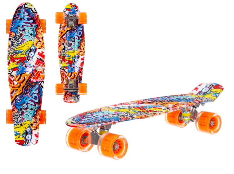 Скейтборд пластиковый с принтом, широкие колеса PU со светом, стойка: алюминиевая, размер платформы: 56 х 15 см.