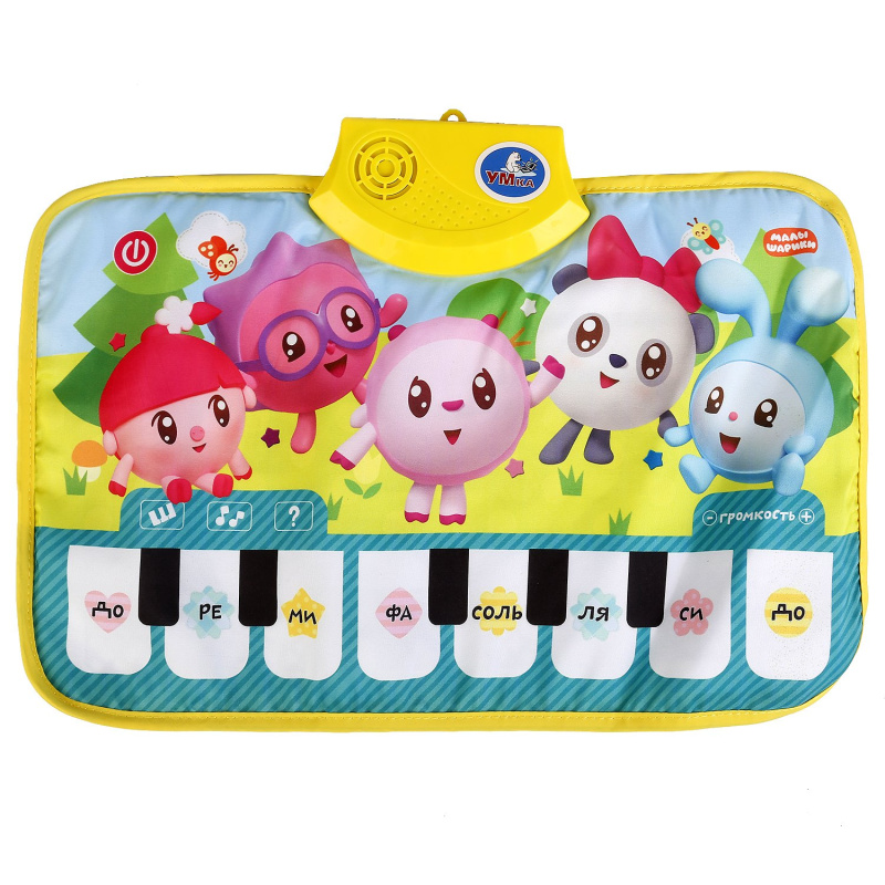 Музыкальный коврик "Малышарики" предназначен для самых маленьких деток. На поверхности крупно изображены герои любимого мультфильма "Смешарики", 9 клавиш пианино с цифрами. Нажимая на кнопки, ребёнок услышит 9 песенок. Игрушка развивает мелкую моторику, координацию, слух, наблюдательность.