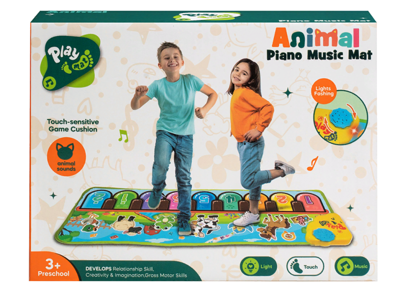 Пианино в форме коврика размером 85*30 см. Функционал: звуки клавиш пианино, звуки животных (лошадки, птички, коровы, лягушки, овечки, гуся), мелодии, регулировка уровня звука, световые эффекты. Посредством кнопки переключателя режимов можно менять звуки клавиш пианино на мелодии. По коврику можно активно ползать и прыгать по нотам. Функции регулировки уровня звука нет. Для работы необходимы 3 батарейки АА (в комплект не входят).