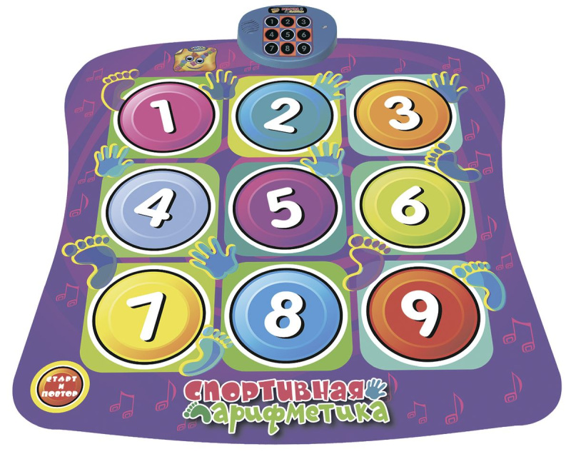 Звуковой напольный коврик «Спортивная арифметика» не только доставит детям удовольствие, но также позволит ближе познакомиться с цифрами. Цель игры - за одну минуту нужно наступить ногой или дотронуться рукой до того сенсорного сектора с цифрой на коврике, изображение которого совпадает с изображением цифры на кнопке, загоревшейся на блоке управлении. Существует пять уровней, различающихся скоростью и количеством загорающихся кнопок. Если на блоке управления загораются несколько цифр одновременно, на коврике надо нажать либо все соответствующие цифры, либо цифру, являющуюся суммой всех цифр. Дети легко обучаются обращению с ним.