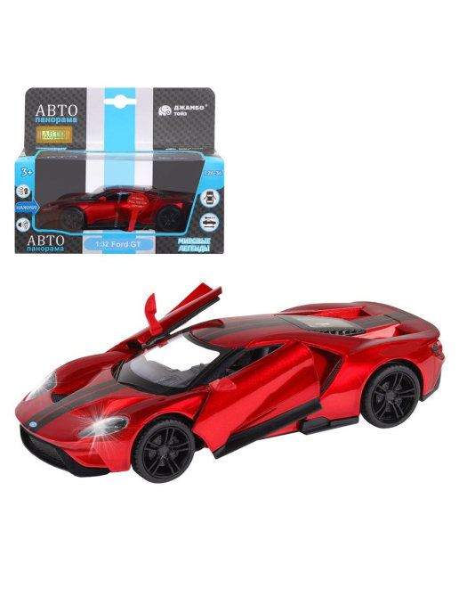 Лицензионная металлическая машинка Ford GT - уменьшенная копия роскошного спортивного автомобиля в масштабе 1:32. Модель машинки детально проработана и выполнена с легко узнаваемым спортивным дизайном как у оригинала. У машинки открываются двери. Если нажать на корпус или открыть двери, загорятся фары и включится звук, что сделает игру более реалистичной. Игрушка оснащена инерционным механизмом. Чтобы она поехала вперед, ее нужно немного откатить назад. Яркий спортивный дизайн, спойлер, обтекаемая форма кузова, спортивный обвес придают суперкару стремительный внешний вид - не машинка, а мечта! Колеса с резиновыми покрышками и литыми дисками, детально проработанный салон, фары, прозрачные окна, выхлопные трубы - всё как у настоящего автомобиля. Благодаря своей реалистичности, модель подойдет для коллекционирования.ТМ "Автопанорама" - собери всю коллекцию!Функции: инерционный механизм, открываются двери, свет, звук