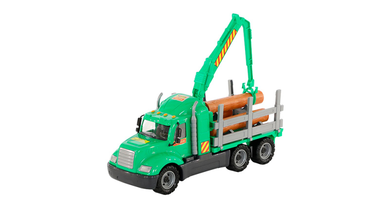 Ярко-зеленый лесовоз «Майк» оснащен вращающимся складным манипулятором на платформе с откидными бортами. Предназначен для детей от 3-х лет. Стойкий к ударам и падениям с заметной ярко-зеленой расцветкой тягач станет незаменимой игрушкой в играх на улице. Все элементы машины выполнены из современного, особо прочного небьющегося пластика. Грузовик выполнен по образу и подобию своих иностранных собратьев: у него такая же обтекаемая форма кабины, две большие боковые выхлопные трубы и мощная радиаторная решетка. Дополняют образ «маячки» наверху кабины. Кабина грузовика «застеклена», а внутри находятся кресла, приборная панель и руль. На крепком корпусе при помощи металлических осей прикреплены три пары больших рельефных колес. За счет такого колесного «оснащения» машина может справиться с любым бездорожьем. Лесовоз «Майк» оснащен платформой, борта которой легко и просто открываются и закрываются. На платформе располагается складной манипулятор с «клещами», имеющий несколько положений.