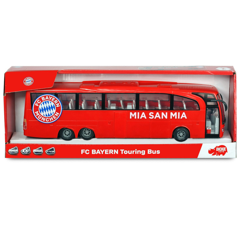 Туристический автобус ФК Бавария от Dickie Toys, каждый день в детской комнате. Реплика большого командного автобуса доступна в оригинальном дизайне ФК Бавария. Прозрачные, большие оконные фасады позволяют заглянуть в оформленный интерьер, который построен как настоящий автобус. Двери можно открыть и раскрыть еще более убедительные детали. Автобус с фрикционным ходом подходит всем игровым идеям. Маленькие футбольные фанаты получат прекрасное дополнение к своему автопарку и смогут в игровой форме открыть для себя особенности автомобиля.