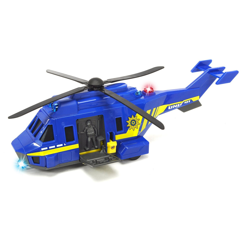 Иногда полицейским при погоне за преступником нужна поддержка с воздуха. Вертолет от компании «Dickie Toys» - выполнен очень реалистично и тщательно, у него открывается боковая панель. На корпусе игрушки расположена кнопка, активизирующая свет фар, проблесковые маячки и звуки.