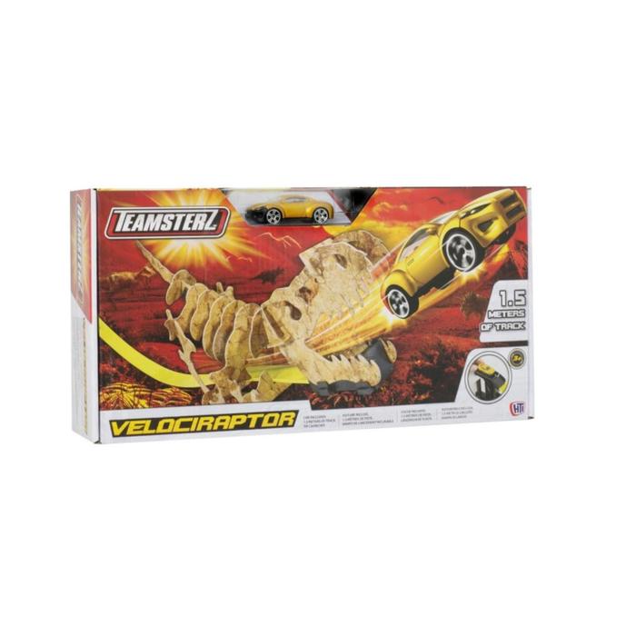 Этот оригинальный трек состоит из пускателя с креплением, 1,5 метров дорожного полотна с трамплином на конце и большого скелета доисторического хищника велоцираптора. В набор также входит одна фирменная машинка.