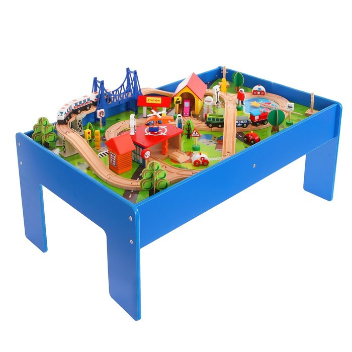 Железная дорога — это красочный набор для сюжетных игр. Большое количество декораций и фигурок позволяет собрать действующий комплекс с транспортной развязкой. Дорожное полотно можно укладывать на уровень выше основного положения рельсов, чтобы организовать многоуровневые съезды и мосты.
