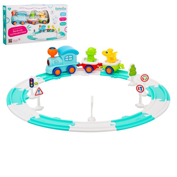 Полотно железной дороги выполнено из пластика и соединяется в круг по технологии паз в паз. Вагончики легко соединяются между собой, а динозаврики-пассажиры двигаются в такт движения поезда в своих вагончиках. В комплекте также 6 дорожных знаков, которые расставляются вдоль всего маршрута.