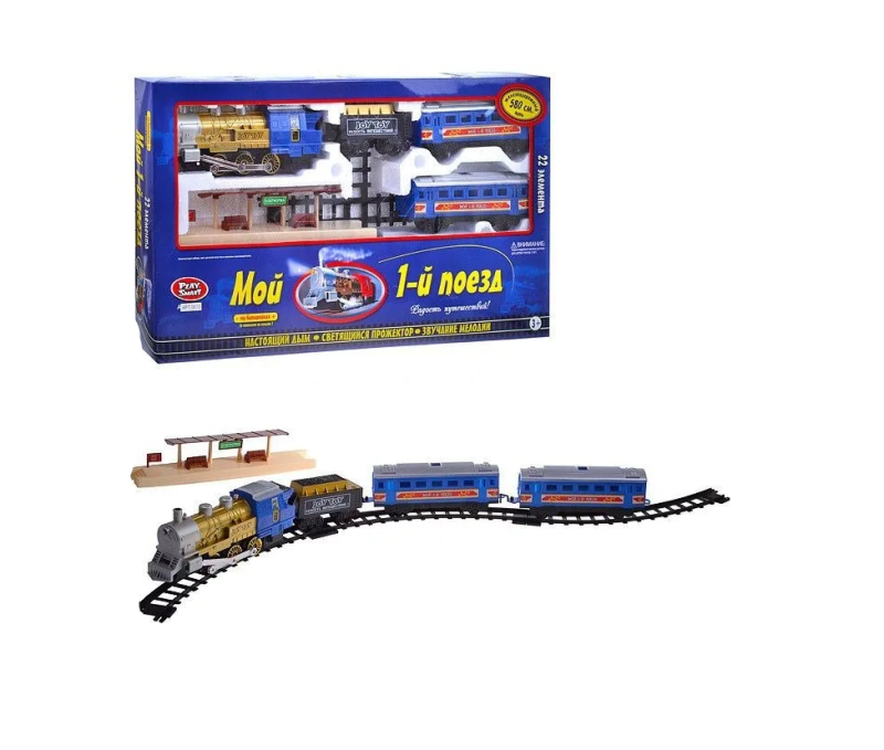 Замечательная железная дорога "Мой первый поезд" от производителя Play Smart обязательно понравится ребенку, и игра с ней увлечет его на долгое время. В комплекте есть детали для сборки дороги, локомотив, вагон, перевозящий уголь, и 2 вагона для пассажиров. Все элементы дороги выполнены в невероятно реалистичном дизайне с большим вниманием к деталям. Передвижение поезда сопровождают звуковые и световые эффекты, а из трубы локомотива выходит дым, как у настоящего паровоза.