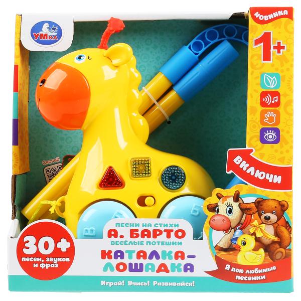 Вашего малыша приведёт в восторг эта игрушка в виде забавной лошадки. Он с удовольствием будет нажимать на кнопки разной формы и слушать весёлые потешки, добрые песенки и разнообразные голоса животных. Кроме того, у игрушки есть колёсики, её можно использовать в виде каталки и возить за верёвочку или с помощью палки.