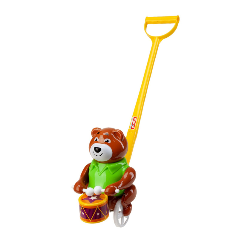 Каталка «Барабанщик» - симпатичный мишка, который умеет стучать палочками по барабану. Наш мишка приветливо улыбается, поэтому на его мордочке всегда доброе выражение. Мишка-барабанщик станет хорошим другом для ребенка на прогулке и дома. Дети будут увлеченно бегать, держась за ручку каталки. Чем быстрее будет бегать ваш малыш, тем активнее мишка будет настукивать свои ритмы и сучить толстыми ножками. Мы уверены, что мишка-барабанщик обязательно понравится всем и подарит замечательное настроение вашим непоседам! Для детей от 1 года.