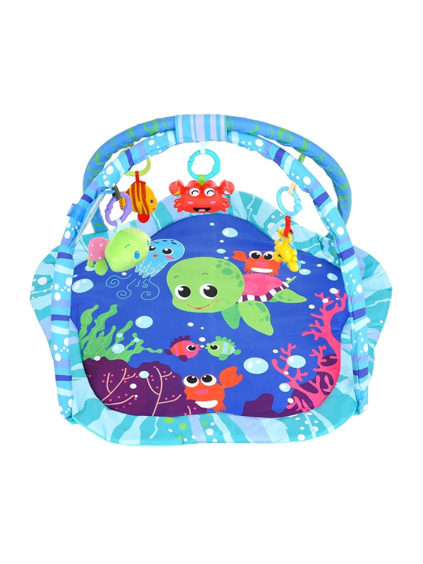 Развивающий коврик с красочными картинками. Игрушки закреплены на дугах на расстегивающихся колечках, легко отсоединяются, с ними можно играть. Отдельно оснащен множеством занимательных элементов. Изготовлен из мягкой набивной велюровой ткани. Легко собирается и разбирается.