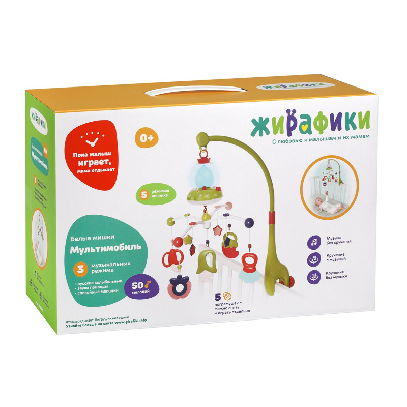Мультифункциональный мобиль «Белые мишки» работает в 3-х музыкальных режимах: русские колыбельные, звуки природы и спокойные мелодии. К мобилю крепятся 5 красочных подвесных игрушек-погремушек, которые будут привлекать внимание малыша и побуждать его к двигательной активности. Сначала кроха будет с интересом разглядывать их, а затем начнёт тянуться к этим привлекательным игрушкам ручками и ножками, развивая таким образом хватательный рефлекс, моторику и внимание.