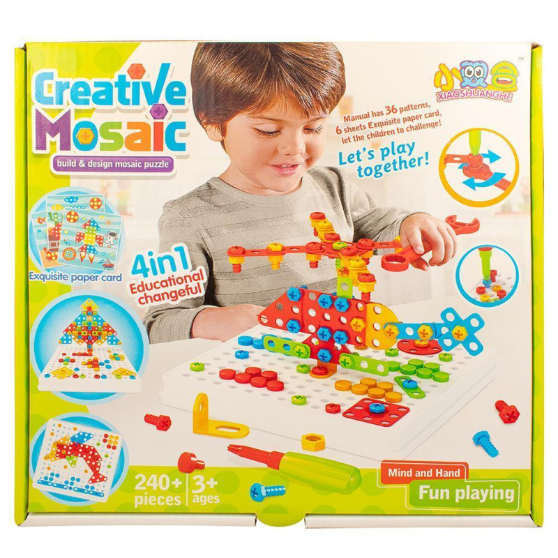 В набор входят: 36 схем-шаблонов, 6 карточек-эскизов, 1 гаечный ключ, 1 отвертка, 1 основание, 1 инструкция, 230 элементов (более 240 составляющих набора).