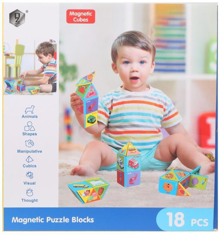 Красочный детский набор «Магнитный конструктор» состоит из 18-ти деталей, 9 из которых имеют треугольную форму, а другие 9 - квадратную. Из них малыш сможет построить всё, что подскажет ему фантазия! Собирая элементы будущей конструкции, ребёнок будет тренировать мелкую моторику рук, координацию движений и развивать логическое мышление. На ярких деталях разного цвета изображены различные здания, машинки, морские обитатели и продукты. Элементы конструктора легко соединяются между собой благодаря встроенным магнитам. Все детали имеют достаточно крупную форму - малышу будет удобно держать их в руке. Длина деталек составляет 6 см. Материал изготовления: пластмасса. Рекомендованный возраст: 3 года +