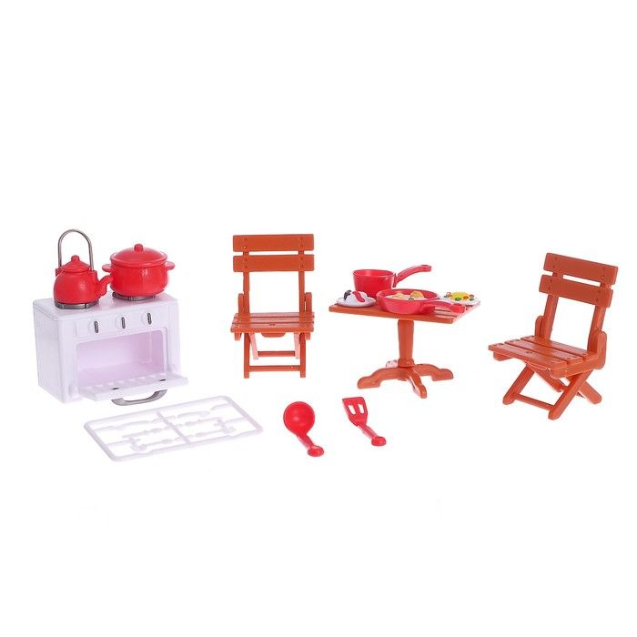 Набор мебели включает обеденную зону (стол со стульями), плиту, посуду и продукты. Яркий дизайн интерьера привлекает внимание малыша и создаёт уютную атмосферу крошикам!