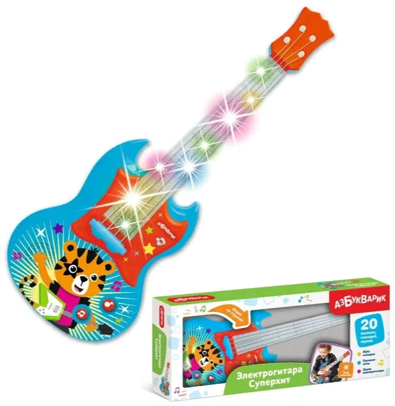 Детская гитара в стиле РОК! У нее крутой современный дизайн, настоящие струны, на которых можно сыграть, гриф с разноцветной подсветкой. Но главное – на музыкальных кнопочках записаны 16 самых модных детских хитов и рок-мелодий в оригинальной аранжировке («Бум-Бум», «Арам зам зам», «Калинка», «Песенка про кузнечика», «Кукарача» и др.).