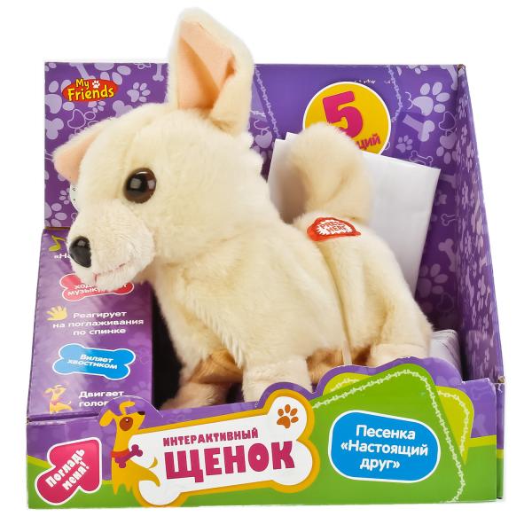 ИНТЕРАКТИВНЫЙ ЩЕНОК "MY FRIENDS" 5 ФУНКЦ., НА БАТ. РУССИФИЦ. ХОДИТ, С МУЗ. В ДИСПЛЕЕ (РУСС. УП.) в кор.24шт Очаровательный щенок Лакки - интерактивная ходячая игрушка, с которой ребёнку никогда не станет скучно! Собачка выглядит очень реалистично: она ходит и лает. При нажатии на кнопку на теле пёсика, проигрывается песенка "Настоящий друг". Щенок белого цвета, шёрстка очень мягкая и приятная на ощупь. Эта милая собачка подарит ребёнку массу положительных эмоций и научит заботится о домашнем любимце! Игрушка работает от 2 батареек типа АА (батарейки входят в комплект). Рекомендовано детям от 3 лет.