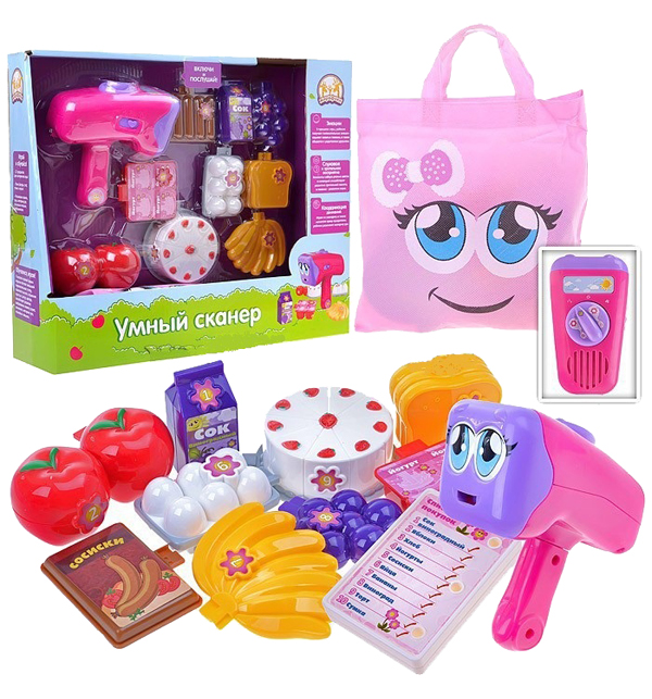 Набор Умный сканер представляет собой замечательный комплект, с которым дети могут представить себя в роли продавцов магазинчика. Сканер с мультяшным лицом может перечислить все наименования и цвета продуктов, входящих в набор. Если перейти на режим Цвета, он скажет забавным голосом о том, что бананы желтого цвета, а яблоки - красного. А с режимом Счет ребенок познакомится с цифрами, он вместе со сканером посчитает сколько ягодок в грозди винограда. Также игрушка умеет петь детскую песенку про тортик и йогурт.