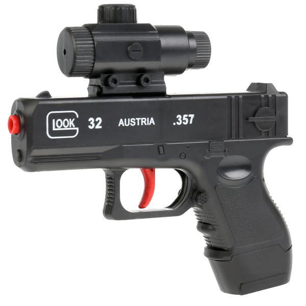 Игровой пистолет с оптическим прицелом, выполненный в виде современного оружия с удобной рукояткой, приведёт юного стрелка в восторг.