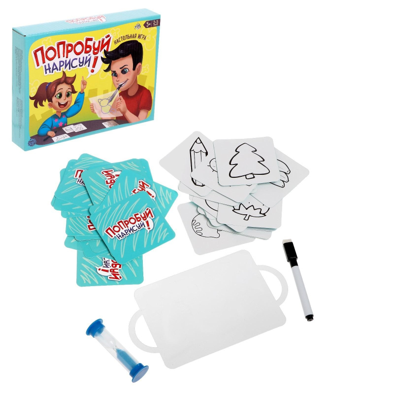 Творческая настольная игра «Попробуй нарисуй» заинтересует любого непоседу! Она рекомендована маленьким художникам старше 5 лет и рассчитана на компанию от 2 до 5 участников. Как играть? Участники собираются за столом и по очереди открывают карточки с заданиями так, чтобы рисунок в карточке видел только водящий. Посмотрели? Маркер в зубы и вперёд! Да, именно так! Пока в песочных часах сыпется песочек, входящий должен без помощи рук, держа маркер в зубах, нарисовать то, что было в задании. Ого, как нарисовал! Что это такое получилось? Кто первым догадается, тот и получит карточку с заданием в свою копилку. После этого участники меняются! В конце игры побеждает тот, кто набрал большее количество карточек. Настольная игра «Попробуй нарисуй» развивает творческое мышление и воображение.