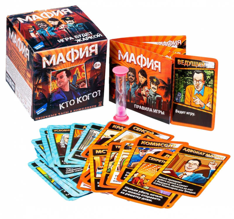 Настольная игра «Мафия» позволит разнообразить досуг компании подростков и увлекательно провести время, разгадывая детективные сюжеты и вычисляя мафию. Игра представлена красочно исполненными карточками с изображением 2-х противоборствующих команд: мирных жителей и мафии. В ходе игры дети потренируют логику, мышление и дедуктивные способности. Мафия - командная психологическая пошаговая ролевая игра с детективным сюжетом. Моделирующая борьбу информированных друг о друге членов организованного меньшинства с неорганизованным большинством. Завязка сюжета: Жители города, обессилевшие от разгула мафии, выносят решение пересажать в тюрьму всех мафиози до единого. В ответ мафия объявляет войну до полного уничтожения всех порядочных граждан. Комплектация: 52 карточки, песочные часы, текстильный мешок