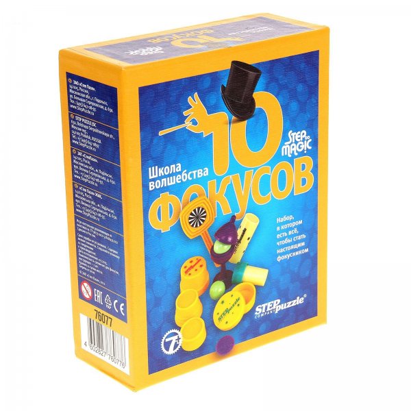 В наборе: магическая коробочка, тросточка для монет, вазочка с шариком, волшебная туба, секретные колпачки, инструкция.