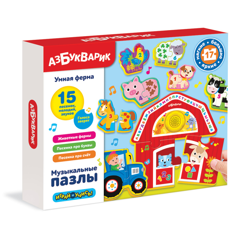 Играть с пазлами не только интересно, но и полезно для малыша! Это занятие развивает логику, мышление, внимание, мелкую моторику. В игровом наборе «Музыкальные пазлы. Умная ферма» ребенок сможет собрать 6 зверюшек фермы, домик и трактор из крупных ярких деталей (всего деталей – 17). Во время этого увлекательного занятия ребенок будет изучать буквы и цифры (они также изображены на пазлах). А с готовыми фигурками можно придумать столько увлекательных игр! Собирать пазлы под музыку еще интереснее! При нажатии на кнопочку малыш послушает 5 веселых песенок и мелодий с голосами зверят и забавными звуками («Считалочка на ферме», «Песенка фермера», «Песенка про алфавит», «Эстонская народная мелодия», «Два весёлых гуся»). Пазлы изготовлены из легкого мягкого материала EVA, с которым удобно и приятно играть.