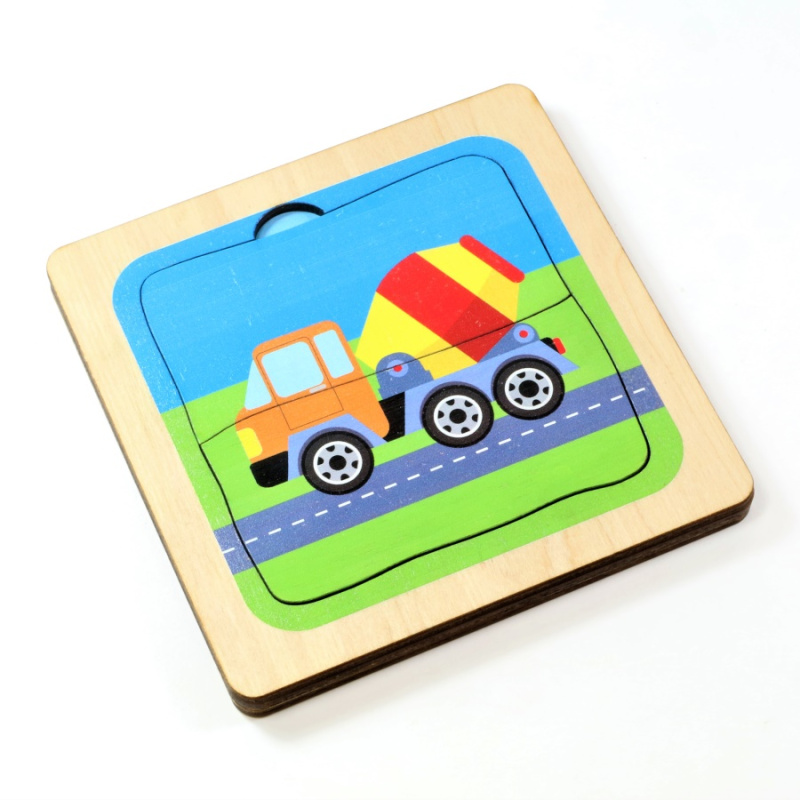В трехслойных пазлах «Машинки» на самом нижнем слое изображен легковой автомобиль. Второй слой с грузовичком состоит из двух половинок, он укладывается поверх предыдущего. Третий слой с бетоновозом также состоит из двух половинок и укладывается поверх двух предыдущих.
