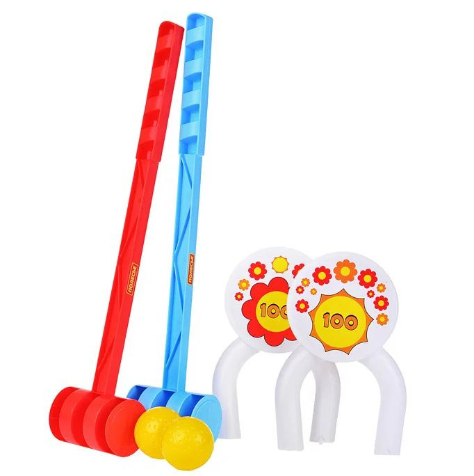 В составе комплекта 6 предметов спортивного инвентаря: пара клюшек-бит двух цветов, два жестких мяча и пара ворот. Длина молотка - 47 см, диаметр мячика - 4 см.