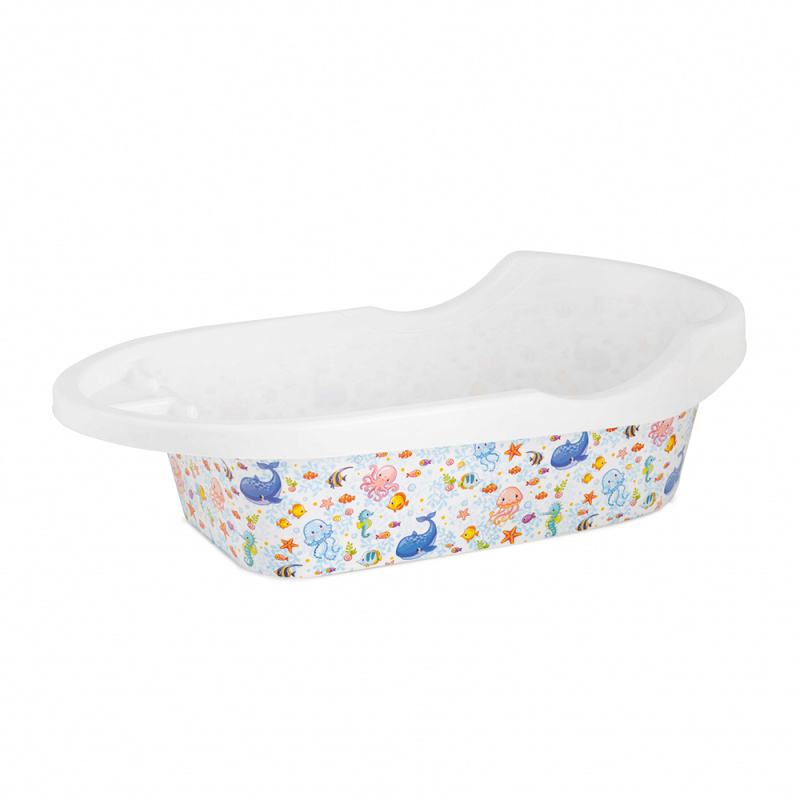 Детская ванна изготовлена из прочного и безопасного пластика. Она облегчит процесс купания ребенка и сделает его интересным. Обтекаемые гладкие формы без острых краев обеспечат безопасность ребенка, а специально оборудованные подлокотники поспособствуют комфортному купанию. Габаритная ванночка вмещает до 45л воды, что поможет создать атмосферу мини бассейна для малыша. Передняя часть изделия оборудована секцией с рельефной поверхностью. Такая конструкция предотвратит соскальзывание мыла с поверхности ванночки при купании. Изделие удобно переносить, благодаря краям изогнутой формы. Использовать ванночку очень удобно вместе с горкой для купания. Декор с рыбками не отклеивается и не стирается во время использования.