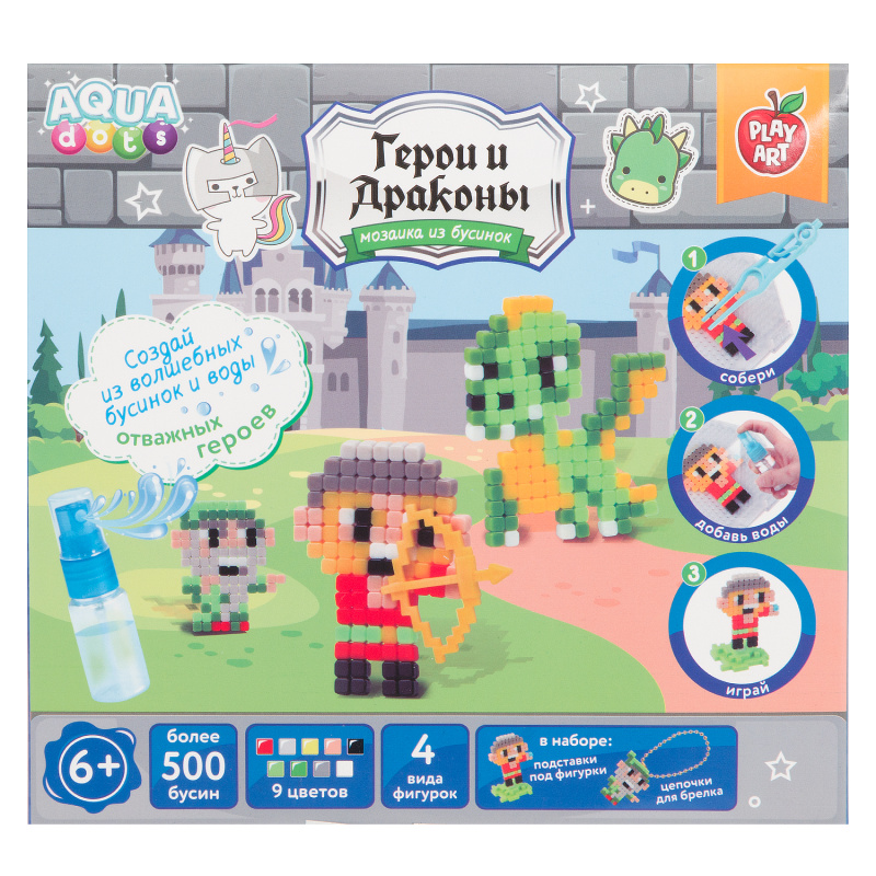 PLAY ART AQUA dots Набор для творчества Герои и драконы это яркие бусины, которые соединяются при помощи воды. Перед игрой внимательно прочитайте инструкцию на упаковке. Комплектность изображена на упаковке. Без механизмов. Произведено из полимерных материалов, с элементами из металла. Предназначено для детей старше 6 лет.