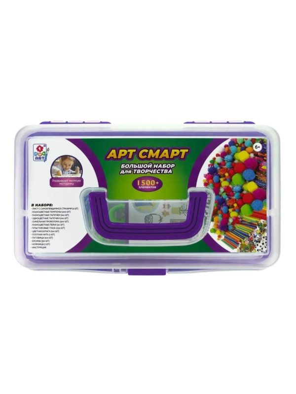 1 TOY ART Большой набор для творчества в трёхъярусном кейсе, фиолетовый. Это уникальный набор для детей и родителей со всем необходимым для создания фигурок, аппликаций, украшений, игрушек и многих других поделок. Набор надолго увлечет ребенка своим разнообразием. Во время такого веселого творческого процесса будут развиваться мелкая моторика, воображение, пространственное мышление и усидчивость. Большой выбор составляющих деталей набора дадут полную свободу для детской фантазии. Также из комплектующих набора можно придумать различные развивающие игры для малышей. Обучение цветам, счету, фигурам, размерам и не только- все это легко воплотить с Большим набором для творчества от 1TOY ART. А прочный и вместительный кейс для хранения позволит быстро собрать и не растерять комплектующие. Набор для поделок выполнен из качественных материалов, безопасных для детей. Такой большой и универсальный набор можно использовать не только дома, но и в детском саду и школе.