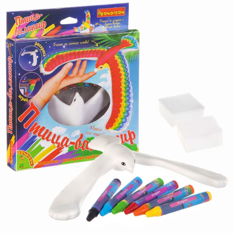 Птица-балансир - магия или наука? Эта необычная игрушка не только способствует развитию творческого потенциала, но и увлекает! Птица балансирует на кончике клюва на любой поверхности - на пальце, на полке, мониторе компьютера… Сможешь ли ты разгадать ее тайну? А если раскраска птички наскучит - ее можно смыть и раскрасить по-новой! Погрузись в мир творчества вместе с Bondibon! Состав набора: пластиковая птица - 1шт., восковые мелки - 6шт., спонж - 2шт.