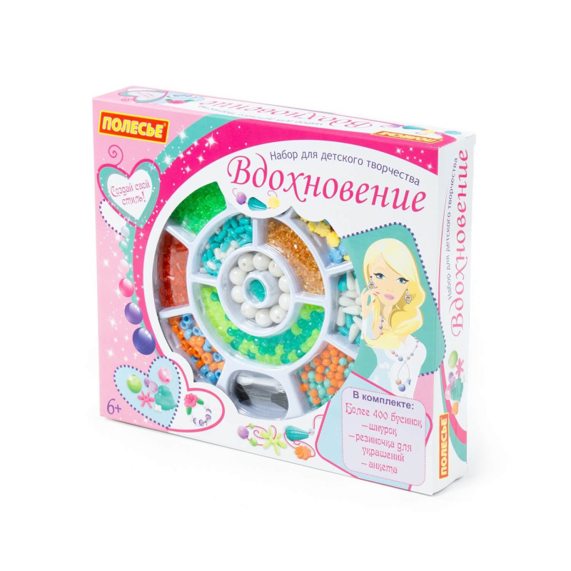Набор для детского творчества "Вдохновение" (435 элементов) (в коробке) от фабрики "Полесье" позволит ребёнку почувствовать себя настоящим дизайнером бижутерии, а также научит создавать удивительные аксессуары! В комплект входит более 400 бусинок, шнурок и резиночка для украшений. Все бусины имеют разную форму и цвет, выполнены из качественного пластика. Разнообразит игру и сделает её ещё интереснее анкета модницы, которая также входит в комплект. Набор способствует разностороннему развитию ребёнка.