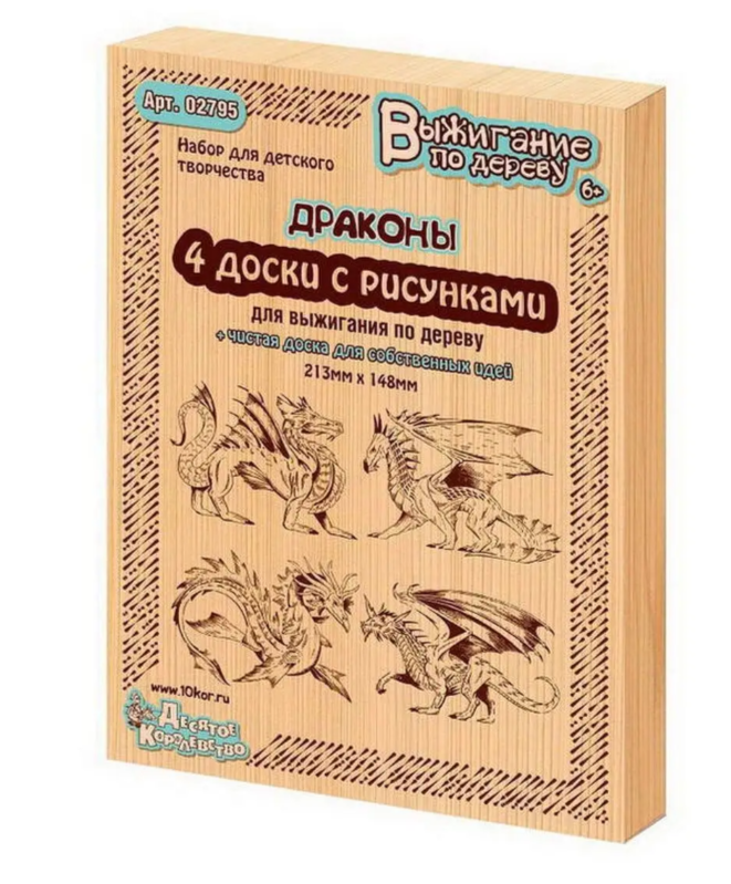 Доски для выжигания Десятое Королевство Драконы, 5 шт (02795). Мифические существа, окутанные завесой таинственности 'Драконы', имеют почитателей по всему миру, притягивают к себе детское внимание, особенно мальчиков. Многие любят создавать их образы в виде рисунков или выжигать. Именно для них мы создали этот набор для выжигания. Он рекомендуется для детей старше 6 , которые уже освоили технику выжигания. Набор состоит из пяти досок, на четырех из которых нанесены рисунки драконов, а пятую мы оставили чистой для реализации своих идей, для этого мы рекомендуем обратиться к нашей библиотеке бесплатных рисунков. Дощечки, а правильно сказать фанерки, имеют размеры близкие формату А5 - 213х148мм при толщине 4мм, сделаны из высококачественной сертифицированной фанеры, а трафареты рисунков выполнены специальной немецкой краской, не выделяющей в процессе горения (нагрева) вредных веществ.