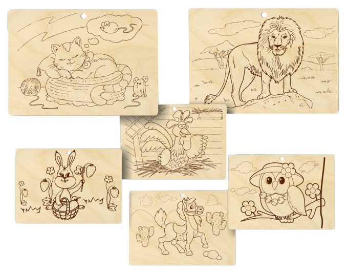 Для этого в комплекте представлено 3 деревянные дощечки с готовыми отверстиями для подвешивания на стену и переводка, которая позволит нанести рисунок для последующего выжигания.