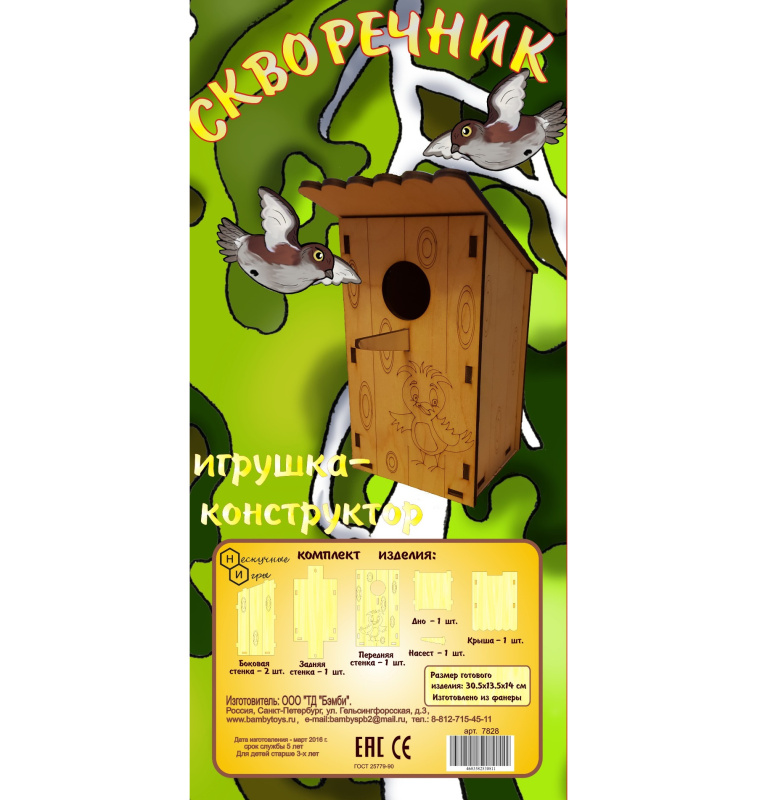 В состав входят детали из фанеры, из которых собирается скворечник. Детали скрепляются между собой с помощью пазов и выступов.