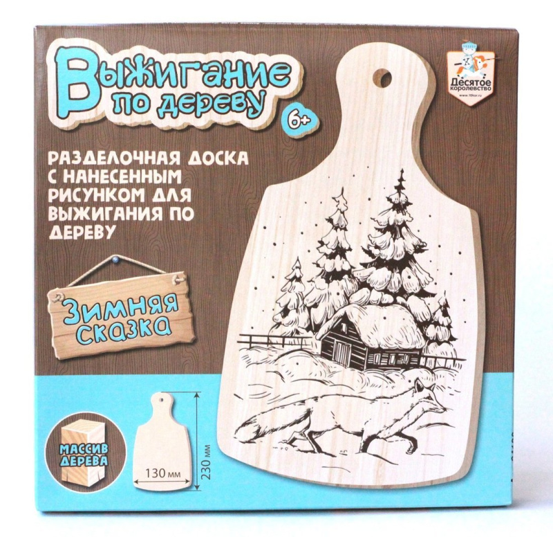 Разделочная доска для выжигания с нанесённым рисунком «Зимняя сказка». Состав: доска с рисунком – 1 шт. (13 х 23 см). Материал: массив дерева. Предназначено для детей от 6 лет. Творческий процесс выжигания развивает мелкую моторику рук, внимание, усидчивость и фантазию.