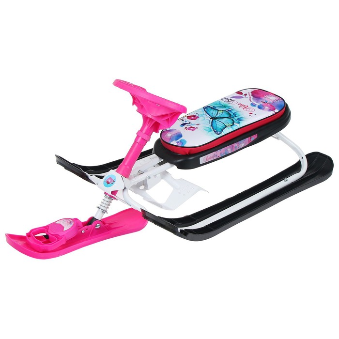 Снегокат предназначен для перевозки детей по плотному снегу или льду, катанию с горок. Имеет сварную конструкцию из стальных труб, пластиковых элементов и мягкое сиденье, обтянутое искусственной кожей с рисунком. Оснащён буксировочным тросом с автоматической намоткой и системой амортизации, которая обеспечивает комфортную поездку по крутым горкам и неровным поверхностям. Усиленный тормоз эффективен на обледенелой поверхности.